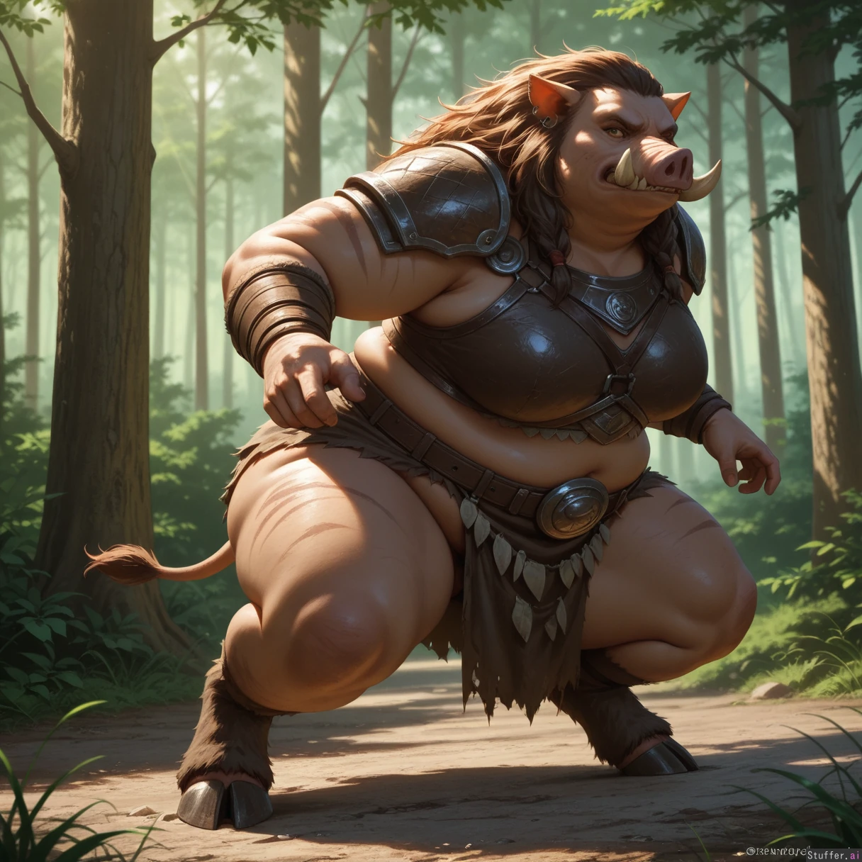 Masterpiece, (1girl), (solo), best quality, looking at viewer, warthog_girl, monster_girl, humanoid_animal, boar_traits, tusks, snout, brown_hair, animal_ears, tusked_mouth, hooves, anthropomorphic, long_hair, detailed_background, forest, foliage, trees, sunlight, horns, muscular_arms, sharp_teeth, fierce_expression, standing_pose, natural_lighting, outdoor, fantasy, creature_design, non_furry, anthropomorphized, warrior_outfit, armor, tribal_marks, jewelry, earrings, belt, shoulder_guard, environmental_detail, depth_of_field, realistic_shading, dynamic_pose, action_ready, earthy_colors (morbidly_obese_girl, curvy, plump,:1.2),
