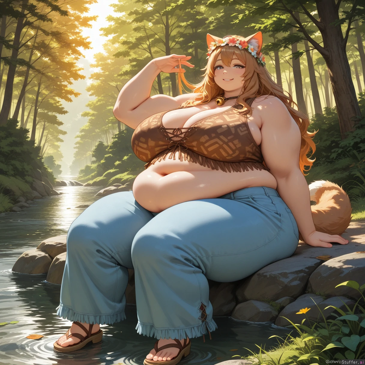 Masterpiece, (1girl), (solo), best quality, looking at viewer, hippie, girl, anthropomorphism, long hair, flower crown, fringe vest, bell bottoms, sandals, peaceful, nature, forest, river, detailed background, sunlight, flowers, leaves, trees, sitting, relaxed, smiling, outdoors, grass, serene, warm colors, gentle expression, animal ears, tail, animal features, casual clothes, flowing hair, bohemian style, scenic, natural lighting (Fat Arms:1.2), (gigantic_thighs,:1.2), (tall female:1.0), (huge breasts:1.0), (gigantic_belly:1.0), (enormous wide hips:1.0), (morbidly_obese_girl, curvy, plump,:1.0), (big muscles:0.999), (muscular arms:0.999), (muscular legs:0.999), (full_body:1.2), detailed background, skindentation, indoors,
