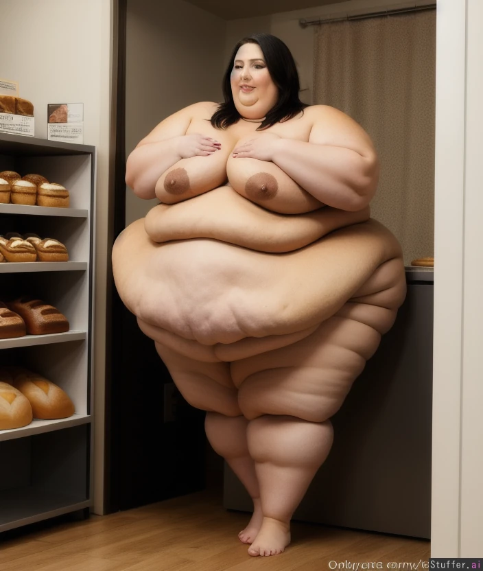 Full body view of beautiful naked super obese model woman indulging inside a super fattening bakery, her body swollen michellin style with rolls upon rolls of soft fat, shameless sexy obesity, doctor approved healthy fat, swollen fat ankles and wrists