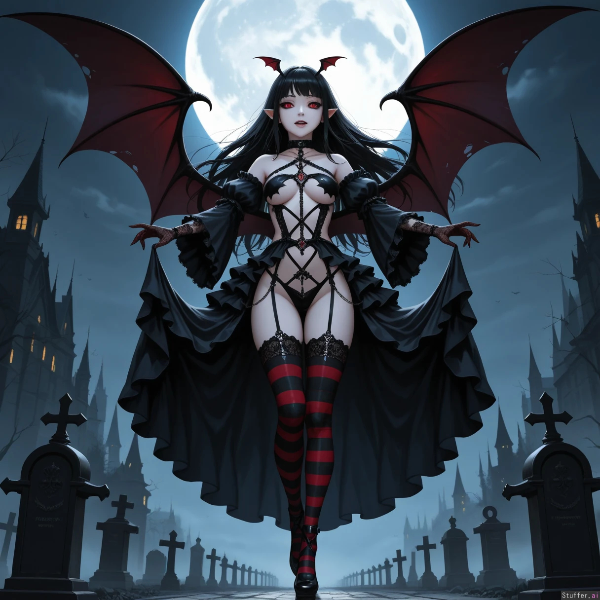 goth girl, bat personification, black hair, black dress, bat wings, pointed ears, pale skin, fangs, dark makeup, red eyes, choker, lace gloves, striped stockings, gothic, detailed background, moonlit night, gothic architecture, cemetery, bats flying, full moon, fog, ornate wrought iron, gravestones, twisted trees, clouds, mist, eerie atmosphere, dramatic lighting, shadows, night sky, windblown hair, flowing dress, jewelry, dark fantasy, mysterious expression, melancholy, intricate details, high contrast, atmospheric perspective, spooky, haunted, moonlight reflections, gothic fashion, bat motif, long hair, layered clothing, detailed textures, artstation quality, cinematic lighting, (revealing_clothes:1.6)