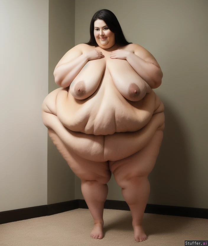 Full body view of beautiful naked model woman, she is fully customizable with selective squishy fat pumping to make her super extremely obese