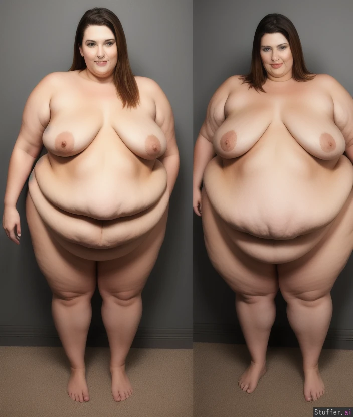 Full body view of beautiful naked model woman, she is fully customizable with optional squishy fat pumping to make her super extremely obese, a man can quickly ruin her shape in a way he likes