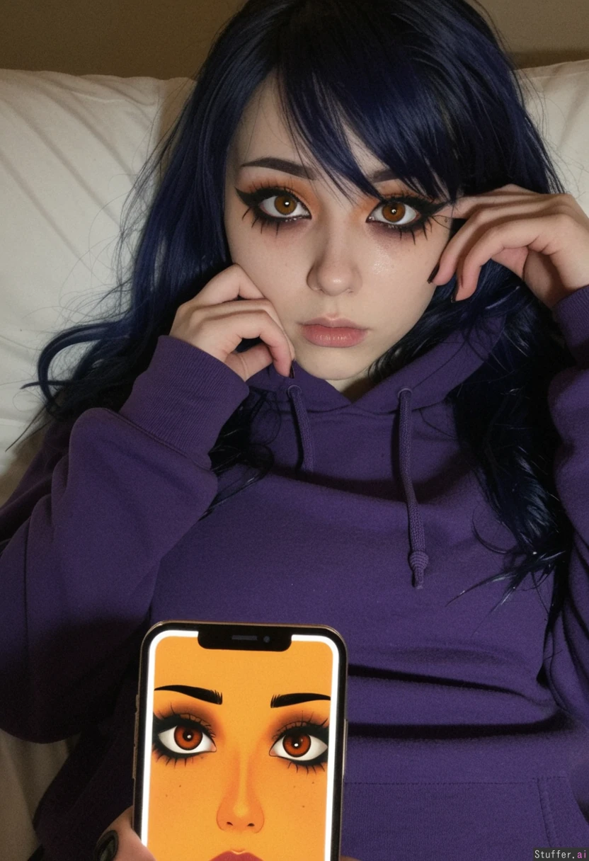 1girl, (long messy dark blue hair, one eye hidden, amber eyes, black dark eye liner goth skin), (purple hoodie), staring at phone,