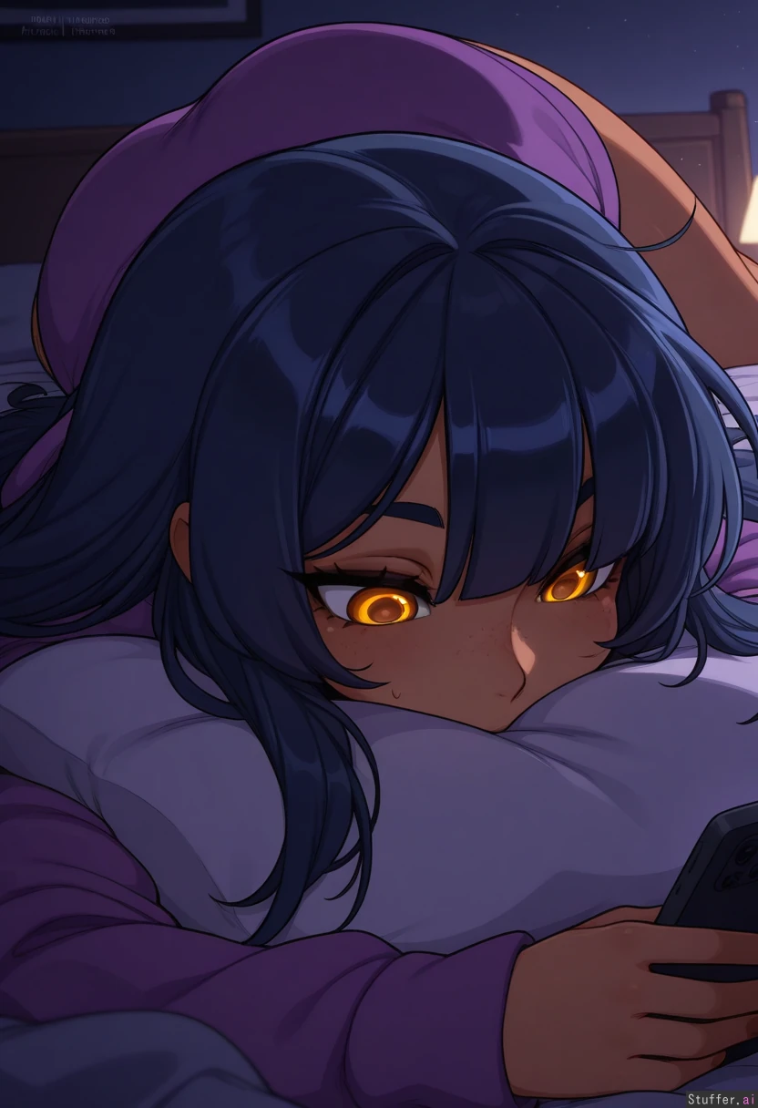 1girl, (long messy dark blue hair, one eye hidden, amber eyes, black dark eye liner goth skin), (purple hoodie), staring at phone,