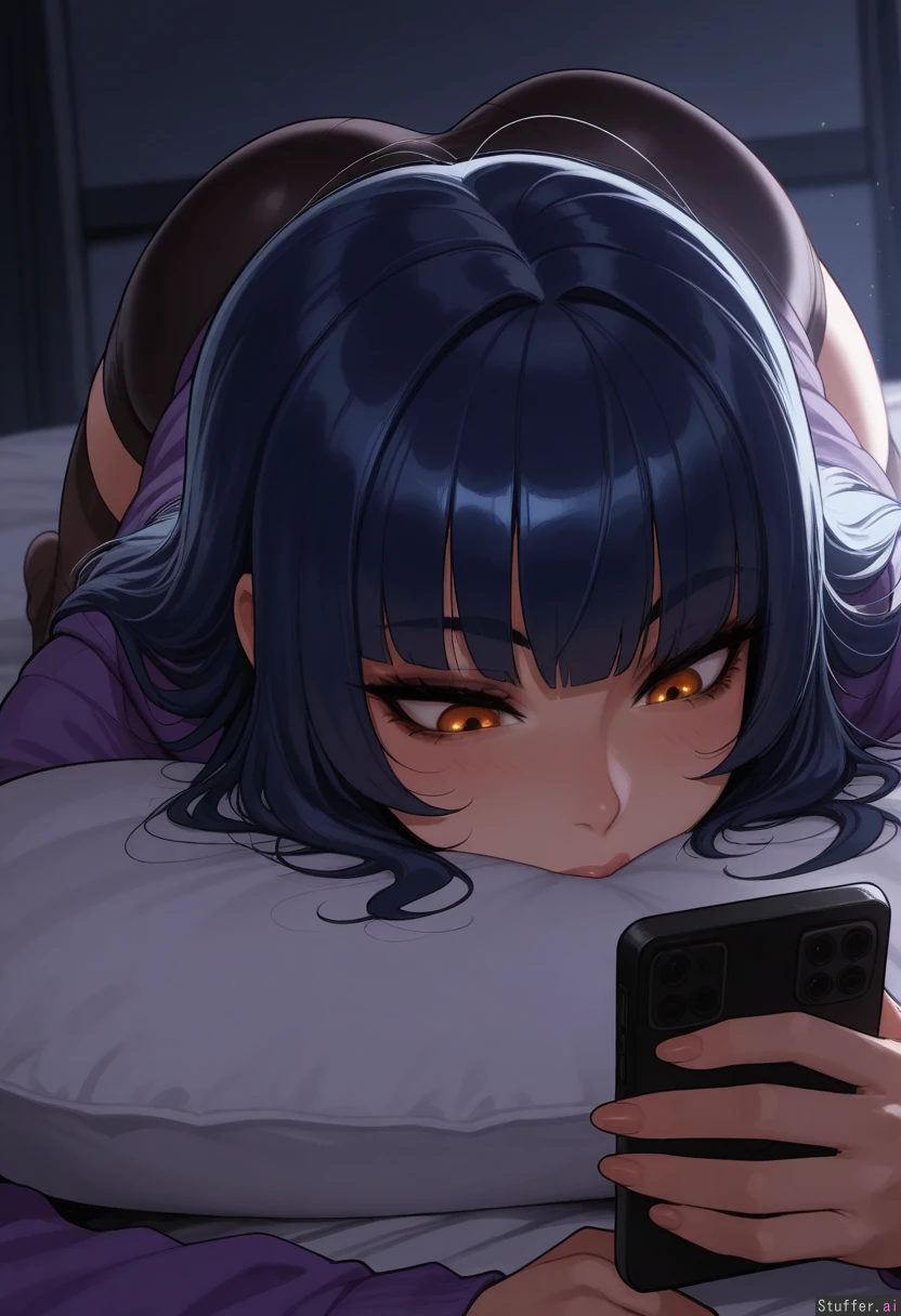 nyantcha:1.3), (krekkov:1.2), (reiq:1.1), (kittew :1.1) best quality, high quality, detailed face, detailed eyes, (merunyaa), (KAMII MOMORU), lying in bed, dark room, 1girl, (long messy dark blue hair, one eye hidden, amber eyes, black dark eye liner goth skin), (purple hoodie), staring at phone,