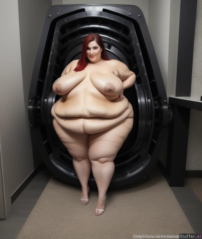 Full body view of beautiful naked model woman, custom woman body shop, a large powerful machine stimulates her body to expand super obese with pure squishy fat, extreme lipedema