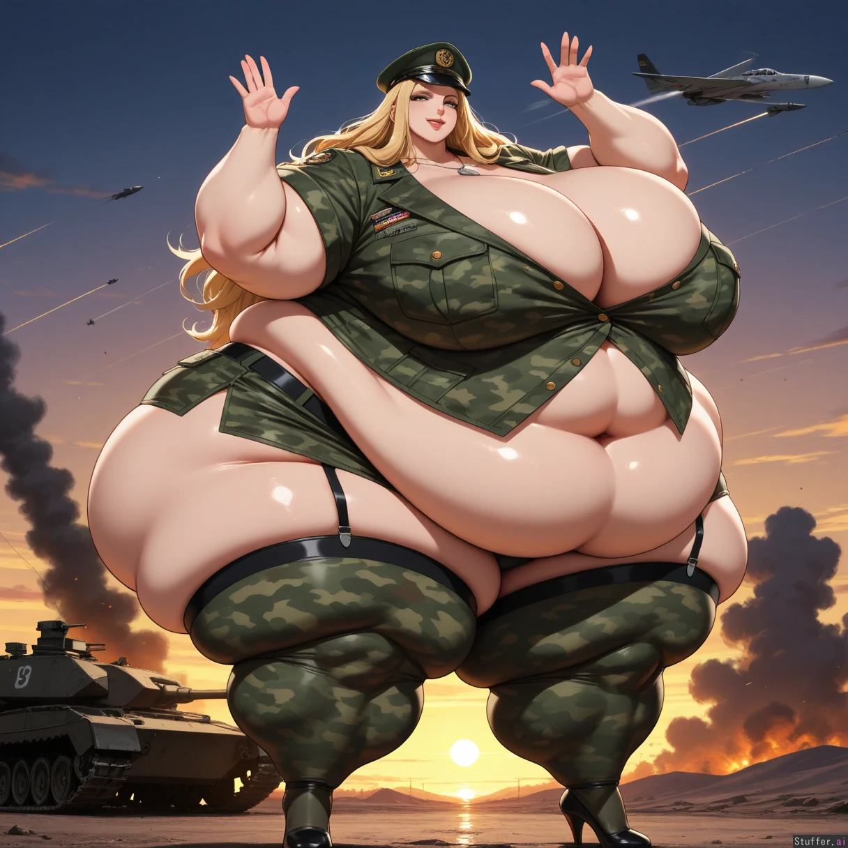 1girl, solo, bimbo, curvy, huge_breasts, cleavage, narrow_waist, thick_thighs, blonde_hair, long_hair, heavy_makeup, glossy_lips, seductive_smile, looking_at_viewer, military_personification, military_uniform, unbuttoned_uniform, camouflage, short_skirt, thighhighs, garter_straps, high_heels, dog_tags, officer_cap, medals, saluting, confident_pose, battlefield, military_base, tanks, fighter_jets, explosions, smoke, waving_flag, sunset, dramatic_lighting, detailed_background, anime_style, highres (Fat Arms:1.2), (gigantic_thighs,:1.2), (tall female:1.0), (huge breasts:1.0), (gigantic_belly:1.0), (enormous wide hips:1.0), (morbidly_obese_girl, curvy, plump,:1.4), (big muscles:0.999), (muscular arms:0.999), (muscular legs:0.999), (full_body:1.2), detailed background, skindentation, indoors, (revealing_clothes:1.2)