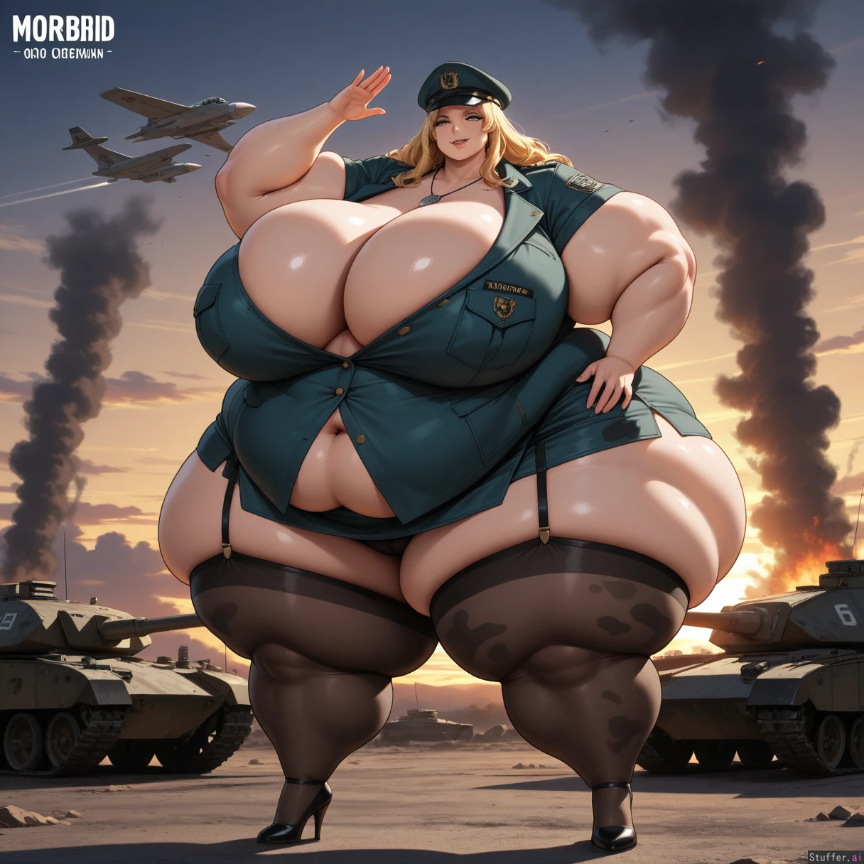 1girl, solo, bimbo, curvy, huge_breasts, cleavage, narrow_waist, thick_thighs, blonde_hair, long_hair, heavy_makeup, glossy_lips, seductive_smile, looking_at_viewer, military_personification, military_uniform, unbuttoned_uniform, camouflage, short_skirt, thighhighs, garter_straps, high_heels, dog_tags, officer_cap, medals, saluting, confident_pose, battlefield, military_base, tanks, fighter_jets, explosions, smoke, waving_flag, sunset, dramatic_lighting, detailed_background, anime_style, highres (Fat Arms:1.2), (gigantic_thighs,:1.2), (tall female:1.0), (huge breasts:1.0), (gigantic_belly:1.0), (enormous wide hips:1.0), (morbidly_obese_girl, curvy, plump,:1.4), (big muscles:0.999), (muscular arms:0.999), (muscular legs:0.999), (full_body:1.2), detailed background, skindentation, indoors, (revealing_clothes:1.2)