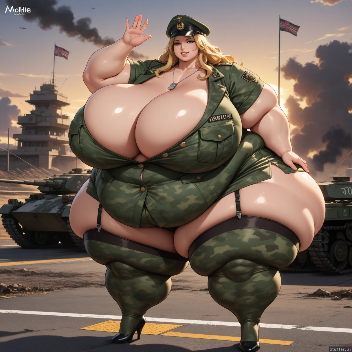 1girl, solo, bimbo, curvy, huge_breasts, cleavage, narrow_waist, thick_thighs, blonde_hair, long_hair, heavy_makeup, glossy_lips, seductive_smile, looking_at_viewer, military_personification, military_uniform, unbuttoned_uniform, camouflage, short_skirt, thighhighs, garter_straps, high_heels, dog_tags, officer_cap, medals, saluting, confident_pose, battlefield, military_base, tanks, fighter_jets, explosions, smoke, waving_flag, sunset, dramatic_lighting, detailed_background, anime_style, highres (Fat Arms:1.2), (gigantic_thighs,:1.2), (tall female:1.0), (huge breasts:1.0), (gigantic_belly:1.0), (enormous wide hips:1.0), (morbidly_obese_girl, curvy, plump,:1.4), (big muscles:0.999), (muscular arms:0.999), (muscular legs:0.999), (full_body:1.2), detailed background, skindentation, indoors, (revealing_clothes:1.2)