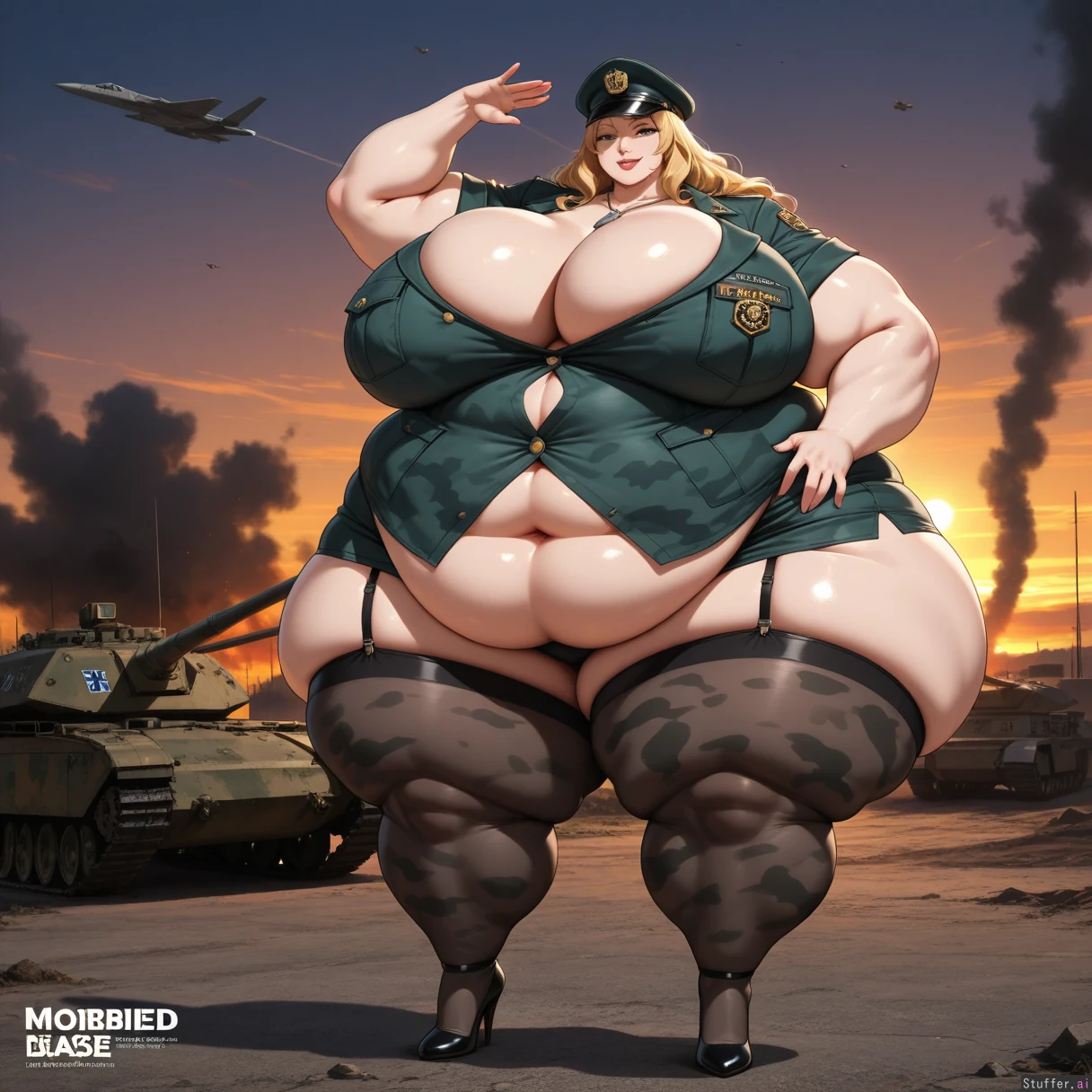 1girl, solo, bimbo, curvy, huge_breasts, cleavage, narrow_waist, thick_thighs, blonde_hair, long_hair, heavy_makeup, glossy_lips, seductive_smile, looking_at_viewer, military_personification, military_uniform, unbuttoned_uniform, camouflage, short_skirt, thighhighs, garter_straps, high_heels, dog_tags, officer_cap, medals, saluting, confident_pose, battlefield, military_base, tanks, fighter_jets, explosions, smoke, waving_flag, sunset, dramatic_lighting, detailed_background, anime_style, highres (Fat Arms:1.2), (gigantic_thighs,:1.2), (tall female:1.0), (huge breasts:1.0), (gigantic_belly:1.0), (enormous wide hips:1.0), (morbidly_obese_girl, curvy, plump,:1.4), (big muscles:0.999), (muscular arms:0.999), (muscular legs:0.999), (full_body:1.2), detailed background, skindentation, indoors, (revealing_clothes:1.2)