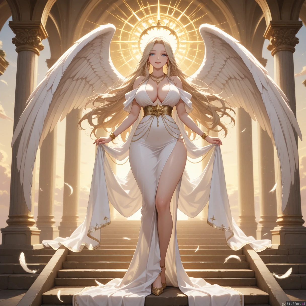 1girl, solo, bimbo, bimbo aesthetic, curvy, large breasts, cleavage, thick thighs, wide hips, slim waist, long hair, platinum blonde hair, voluminous hair, glossy lips, lip gloss, heavy makeup, long eyelashes, blue eyes, seductive smile, looking at viewer, halo, angel, angel wings, feathered wings, white wings, heavenly theme, heaven personification, divine aura, glowing skin, radiant light, soft glow, ethereal lighting, white dress, sheer dress, flowing dress, high heels, jewelry, gold jewelry, pearl necklace, bracelets, manicured nails, pink nails, glamorous, sensual pose, standing, arms slightly raised, confident pose, clouds, fluffy clouds, golden sky, sun rays, god rays, celestial background, heavenly gates, ornate gates, marble pillars, marble stairs, floating feathers, sparkles, shimmering particles, divine light beams, pastel sky, sunrise sky, distant paradise landscape, fantasy scenery, extremely detailed background, depth of field, soft focus, high detail, masterpiece, best quality