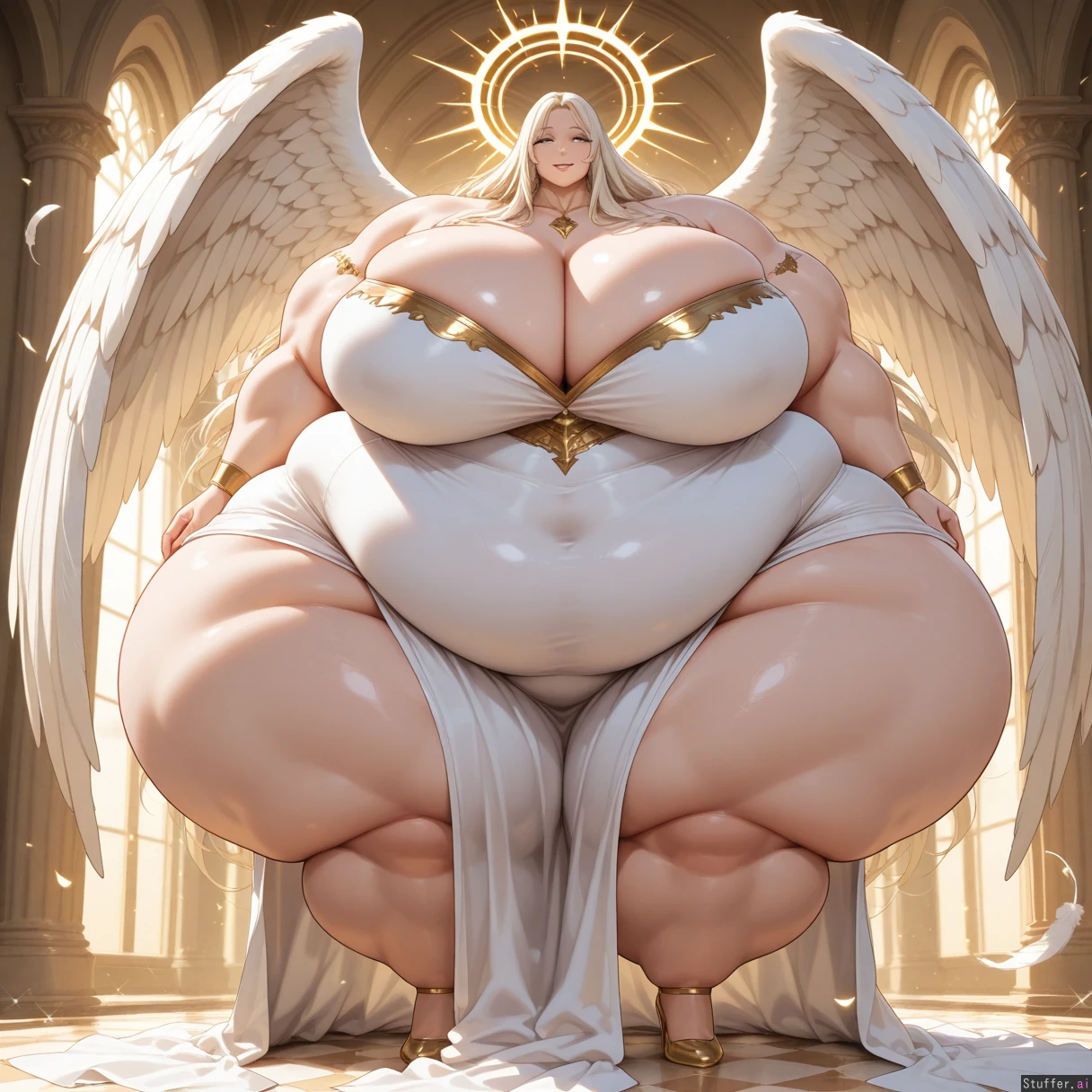 1girl, solo, bimbo, curvy, large breasts, cleavage, thick thighs, slim waist, platinum blonde hair, long hair, blue eyes, heavy makeup, glossy lips, long eyelashes, seductive smile, halo, angel wings, white wings, heaven personification, glowing skin, divine aura, white dress, sheer dress, gold jewelry, high heels, confident pose, looking at viewer, clouds, golden sky, sun rays, heavenly gates, marble pillars, floating feathers, sparkles, ethereal lighting, detailed background, masterpiece, best quality (Fat Arms:1.2), (gigantic_thighs,:1.2), (tall female:1.0), (enormous wide hips:1.0), (morbidly_obese_girl, curvy, plump,:1.4), (big muscles:1.2), (muscular arms:1.2), (muscular legs:1.2), (full_body:1.2), detailed background, skindentation, indoors,