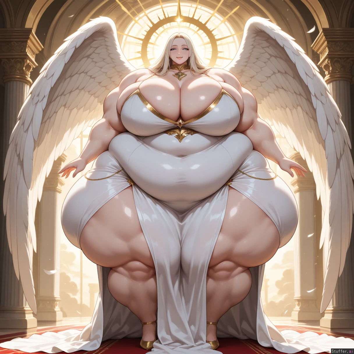 1girl, solo, bimbo, curvy, large breasts, cleavage, thick thighs, slim waist, platinum blonde hair, long hair, blue eyes, heavy makeup, glossy lips, long eyelashes, seductive smile, halo, angel wings, white wings, heaven personification, glowing skin, divine aura, white dress, sheer dress, gold jewelry, high heels, confident pose, looking at viewer, clouds, golden sky, sun rays, heavenly gates, marble pillars, floating feathers, sparkles, ethereal lighting, detailed background, masterpiece, best quality (Fat Arms:1.2), (gigantic_thighs:1.2), (tall female:1.0), (enormous wide hips:1.0), (morbidly_obese_girl, curvy, plump,:1.4), (big muscles:1.2), (muscular arms:1.2), (muscular legs:1.2), (full_body:1.2), detailed background, skindentation, indoors,