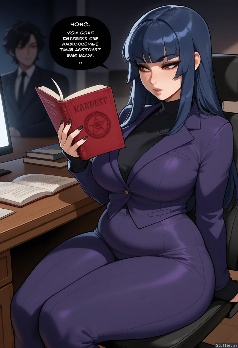 nyantcha:1.3), (krekkov:1.2), (reiq:1.1), (kittew :1.1) best quality, high quality , detailed face, detailed eyes, (merunyaa), (KAMII MOMORU), Sitting behind a large deck writing in a book 1girl, (long messy dark blue hair, one eye hidden, amber eyes, black dark eye liner goth skin), (purple business suit), staring at book, large hips, wide waist, chubby belly, fat thighs, large love handles