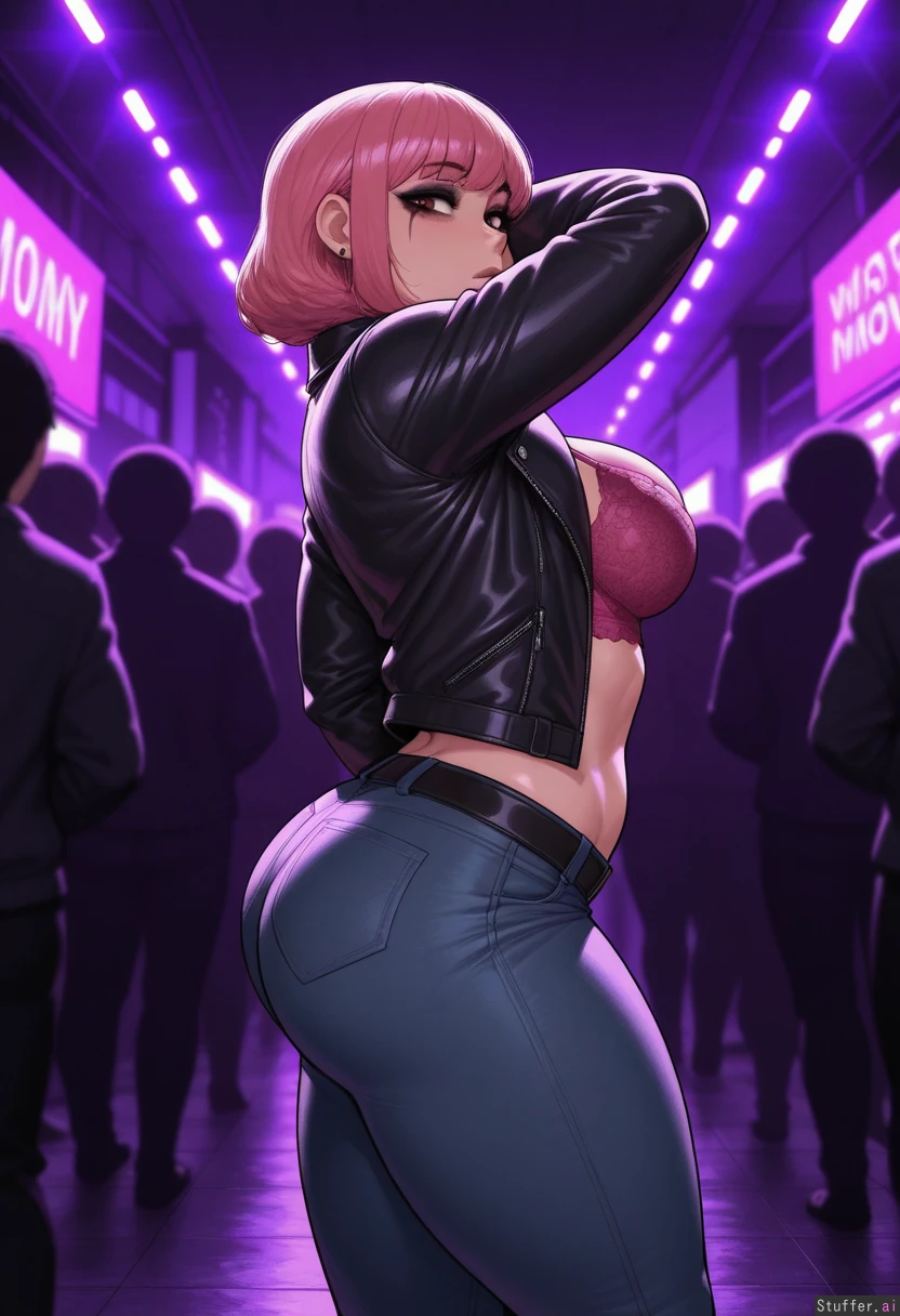masterpiece, best quality. (Krekkov (artist)) (1girl, solo), (pink hair, brown eyes), medium breasts, dark makeup Night, part, crowd, dark purple lighting Open_jacket, leather_jacket (goth mommy), standing up, pink_lace_bra, black_denim Toned, curvy, big butt
