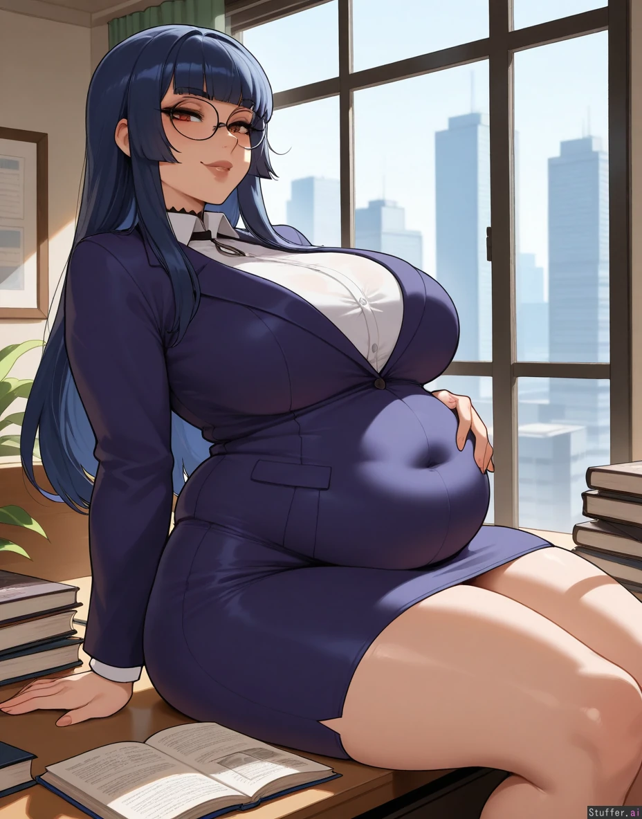 nyantcha:1.3), (krekkov:1.2), (reiq:1.1), (kittew :1.1) best quality, high quality , detailed face, detailed eyes, (merunyaa), (KAMII MOMORU), Sitting behind a large deck writing in a book. Both hands on desk. Behind desk. In a large office filled with green plant. Behind her glass window with city behind it 1girl morbidly super fat obese , (long messy dark blue hair, one eye hidden, super detailed amber eyes, black dark eye liner goth skin), (purple business suit), writing in book at desk, large hips, wide fat waist, giant chubby belly, fat thighs, large love handles, wide chubby fat body