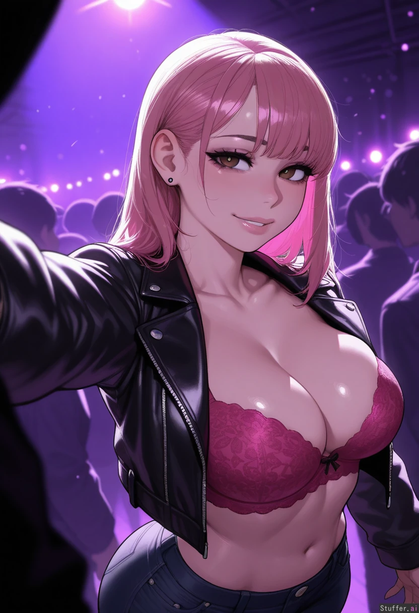 masterpiece, best quality. ((Krekkov)) best quality, intricate details, detailed eyes, (soft shading), dim lighting, (1girl, solo), (pink hair, brown eyes), medium breasts, black_eyelashes, pink_eyeliner Night, party, crowd, dark purple lighting Open_jacket, leather_jacket (goth mommy), standing up, pink_lace_bra, black_denim Toned, curvy, big butt