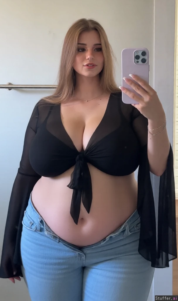 best quality, extremely_obese, body_massive_and_soft, very_large_hanging_belly, very_big_fat_heavy_natural_breasts, extremely_wide_hips_and_thick_thighs, body_overflowing_naturally, heavy_weight_gain, same_pose_and_framing, realistic_mass, same_look_but_significantly_heavier, bigger_top_on, remove watermark,