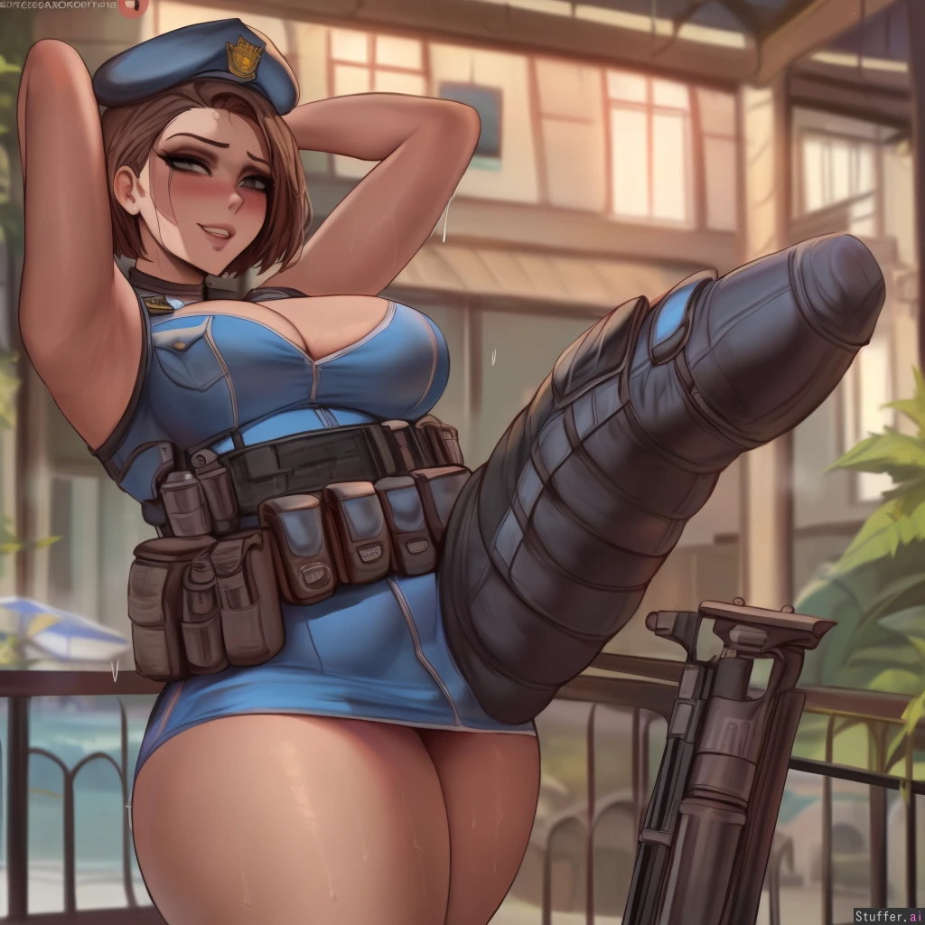 best quality, high rating, best quality, high rating,(Kittew\(artist\), shexyo\(artist\),ourobot\(artist\)0.5); **appearance** (Jill Valentine), Home, police uniform, wearing a military beret, (tactical belt around her waist:1.3),(light brown skin), Standing, hands behind head, Grinning, sweating, blushing, (hyper detailed realistic eyes:1.3), (solo), (((extremely tight belly))), ((bloated belly)), fat rolls, love handles,((round bloated belly)),