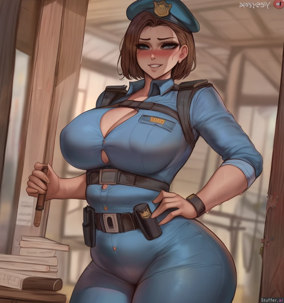 best quality, high rating, best quality, high rating,(Kittew\(artist\), shexyo\(artist\),ourobot\(artist\)0.5); **appearance** (Jill Valentine), Home, fully clothed, (button down police uniform), wearing a military beret, (light brown skin), Standing, nipple indents, Grinning, sweating, blushing, (hyper detailed realistic eyes:1.3), (solo), fat rolls, love handles,((round bloated belly)), ((swollen belly))