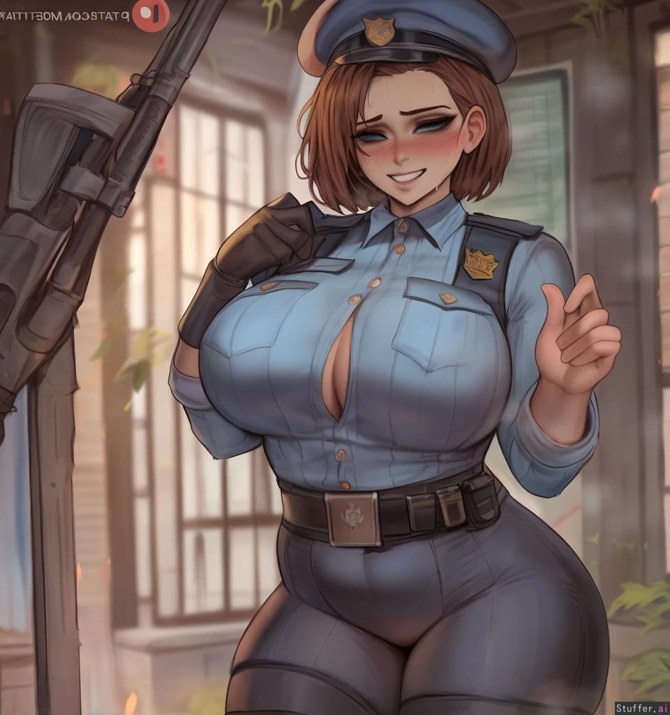 best quality, high rating, best quality, high rating,(Kittew\(artist\), shexyo\(artist\),ourobot\(artist\)0.5); **appearance** (Jill Valentine), Home, fully clothed, (button down police uniform), wearing a military beret, (light brown skin), Standing, nipple indents, Grinning, sweating, blushing, (hyper detailed realistic eyes:1.3), (solo), fat rolls, love handles,((round bloated belly:1.2)), ((swollen belly:1.2)),