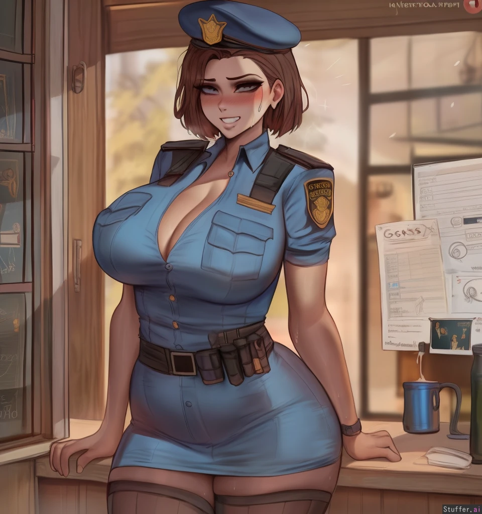 best quality, high rating, best quality, high rating,(Kittew\(artist\), shexyo\(artist\),ourobot\(artist\)0.5); **appearance** (Jill Valentine), Home, fully clothed, (button down police uniform), wearing a military beret, (light brown skin), Standing, nipple indents, milk-filled breasts, Grinning, sweating, blushing, (hyper detailed realistic eyes:1.3), (solo), fat rolls, love handles,((round bloated belly:1.2)), ((swollen belly:1.2)),