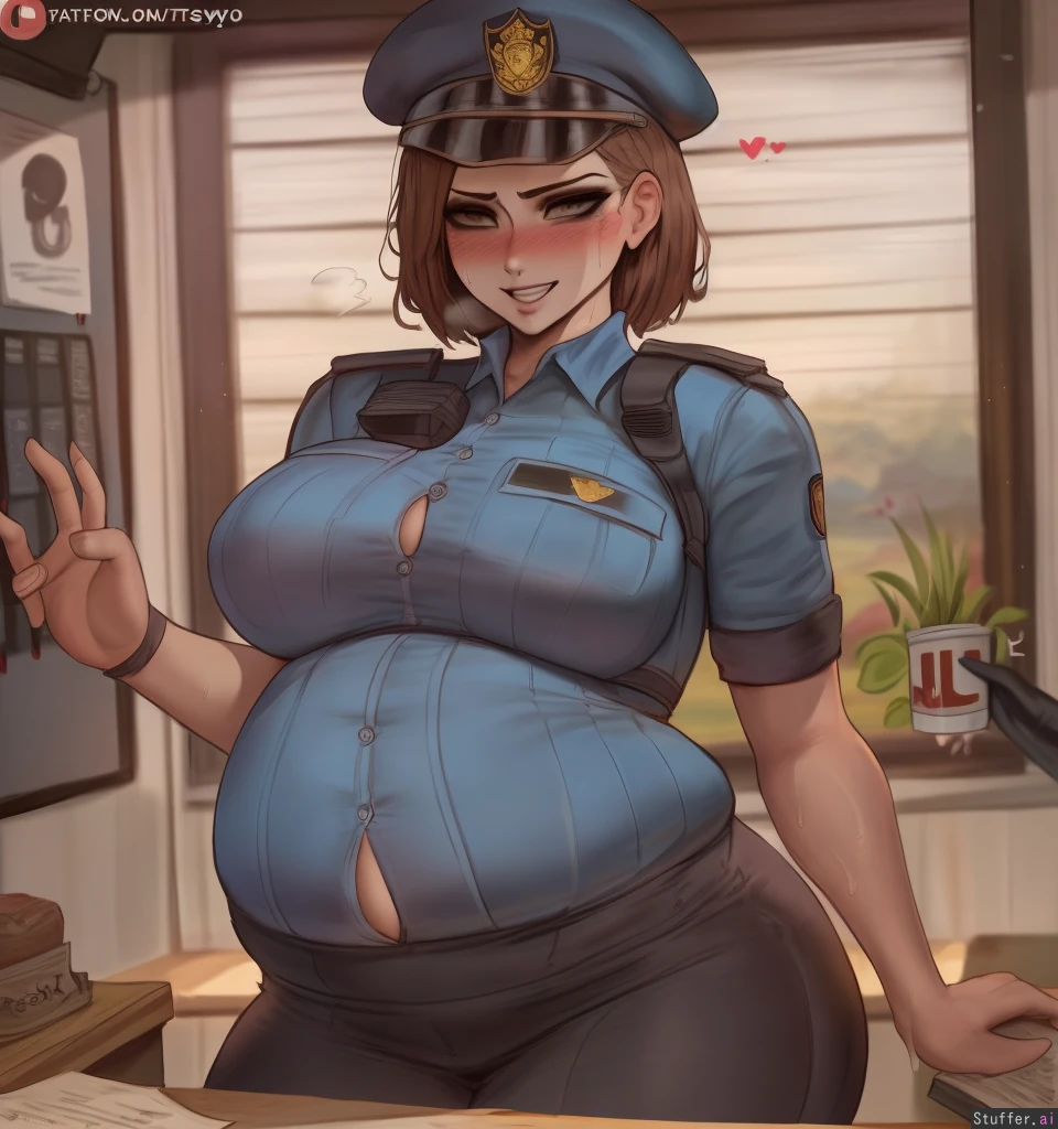 best quality, high rating, best quality, high rating,(Kittew\(artist\), shexyo\(artist\),ourobot\(artist\)0.5); **appearance** (Jill Valentine), Home, fully clothed, (button down police uniform), wearing a military beret, (light brown skin), Standing, nipple indents, Grinning, sweating, blushing, (hyper detailed realistic eyes:1.3), (solo), fat rolls, love handles,((round bloated belly:1.2)), ((big swollen belly pushing against shirt:1.3))