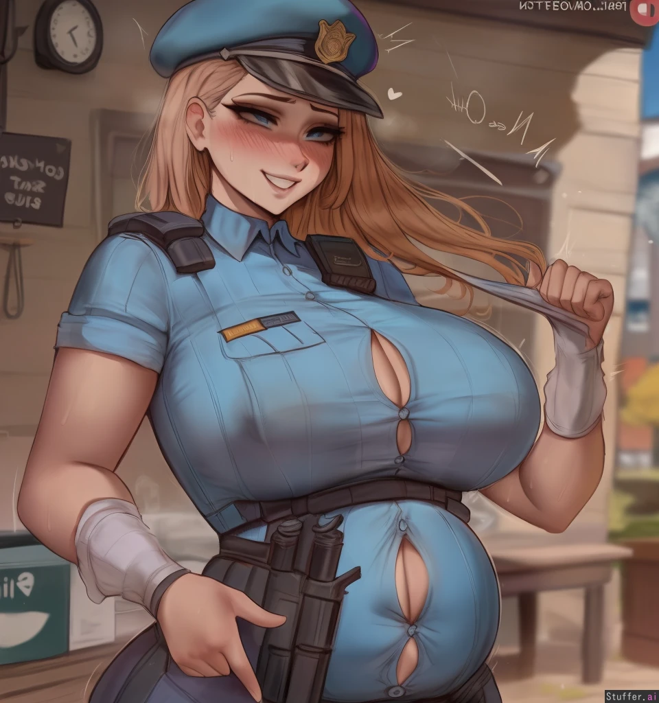 best quality, high rating, best quality, high rating,(Kittew\(artist\), shexyo\(artist\),ourobot\(artist\)0.5); **appearance** (Jill Valentine), Home, fully clothed, (button down police uniform), wearing a military beret, (light brown skin), Standing, nipple indents, Grinning, sweating, blushing, (hyper detailed realistic eyes:1.3), (solo), fat rolls, love handles,((round bloated belly:1.2)), ((big swollen belly pushing against shirt:1.3)), (buttons popping)