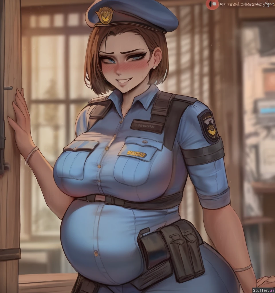 best quality, high rating, best quality, high rating,(Kittew\(artist\), shexyo\(artist\),ourobot\(artist\)0.5); **appearance** (Jill Valentine), Home, fully clothed, (button down police uniform), wearing a military beret, (light brown skin), Standing, nipple indents, Grinning, sweating, blushing, (hyper detailed realistic eyes:1.3), (solo), fat rolls, ((rotund)), love handles, ((big swollen belly pushing against shirt:1.3)),