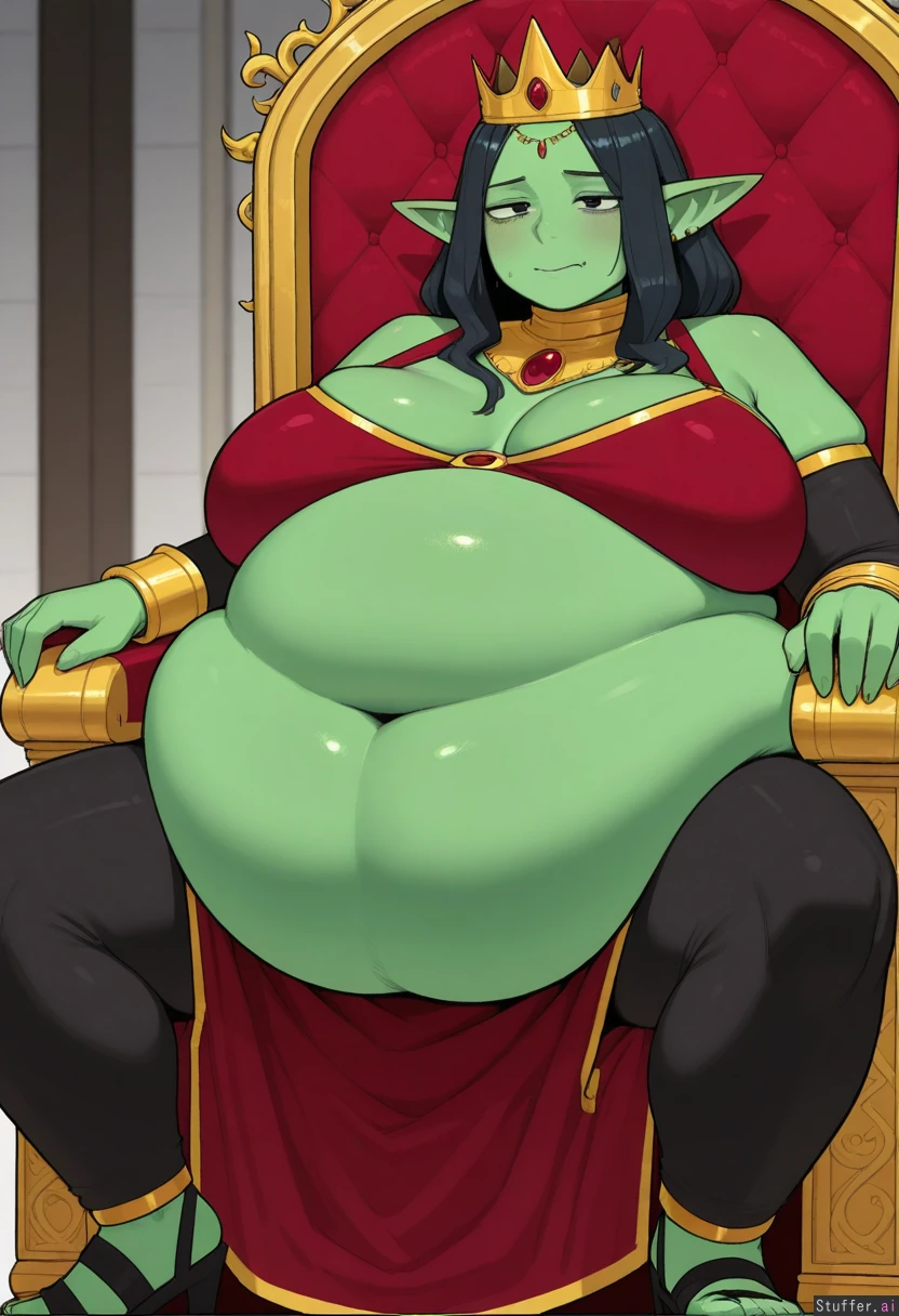 artist ohasi_art, lewdlemage, perfect quality, (Massive tummy:1.6), 8k , green skin, beautiful, solo, (Goblin), sitting on large throne, queen, (extremely chubby fat :1.4), tired look,flirty, burp, spread legs belly in lap,