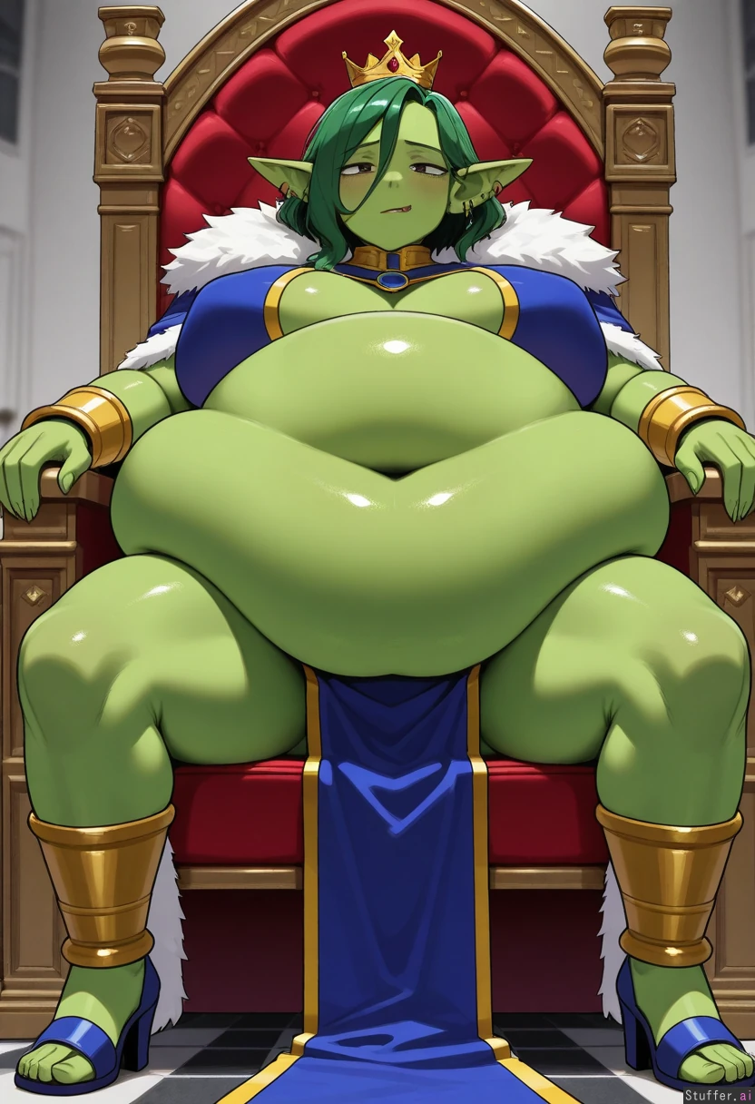 artist ohasi_art, lewdlemage, perfect quality, (Hyper Massive tummy:1.4), 8k , green skin, beautiful, solo, (Goblin), sitting on large throne, queen, (obese:1.4), tired look,flirty, burp, spread legs belly in lap, fat body, (ssbbw:1.3)