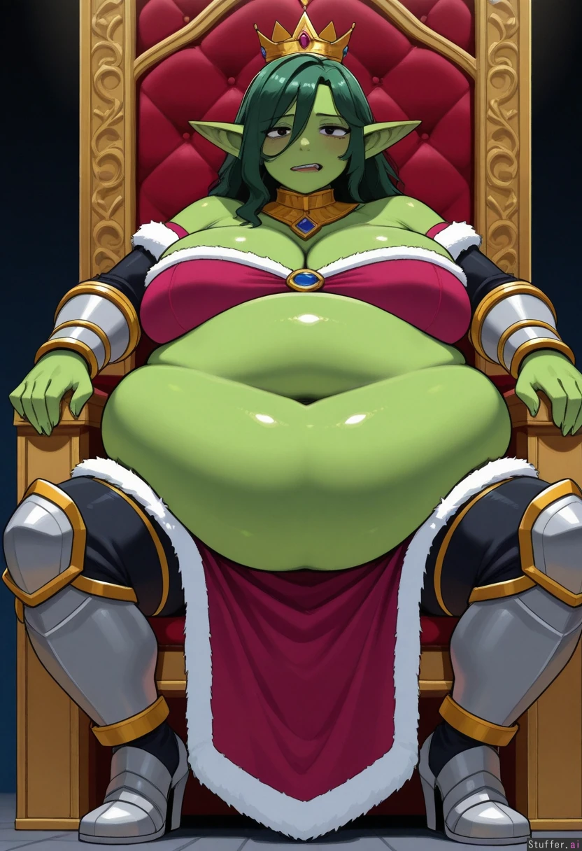 artist ohasi_art, lewdlemage, perfect quality, (Hyper Massive tummy:1.4), 8k , green skin, beautiful, solo, (Goblin), sitting on large throne, queen, (obese:1.4), tired look,flirty, burp, spread legs belly in lap, fat body, (ssbbw:1.3)