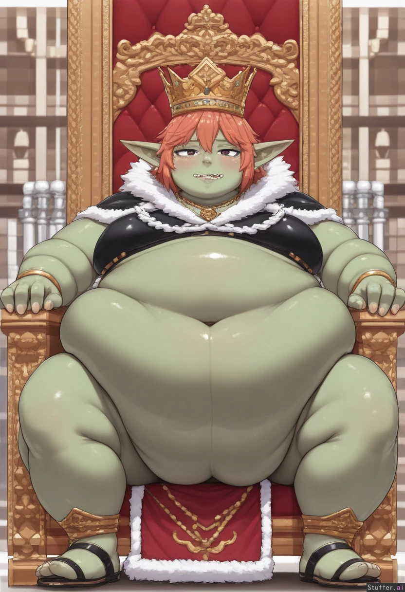 artist ohasi_art, lewdlemage, perfect quality, (Hyper Massive tummy:1.4), 8k , green skin, beautiful, solo, (Goblin), sitting on large throne, queen, (very obese:1.4), tired look,flirty, burp, spread legs belly in lap, fat body, ssbbw,ussbbw, immobile