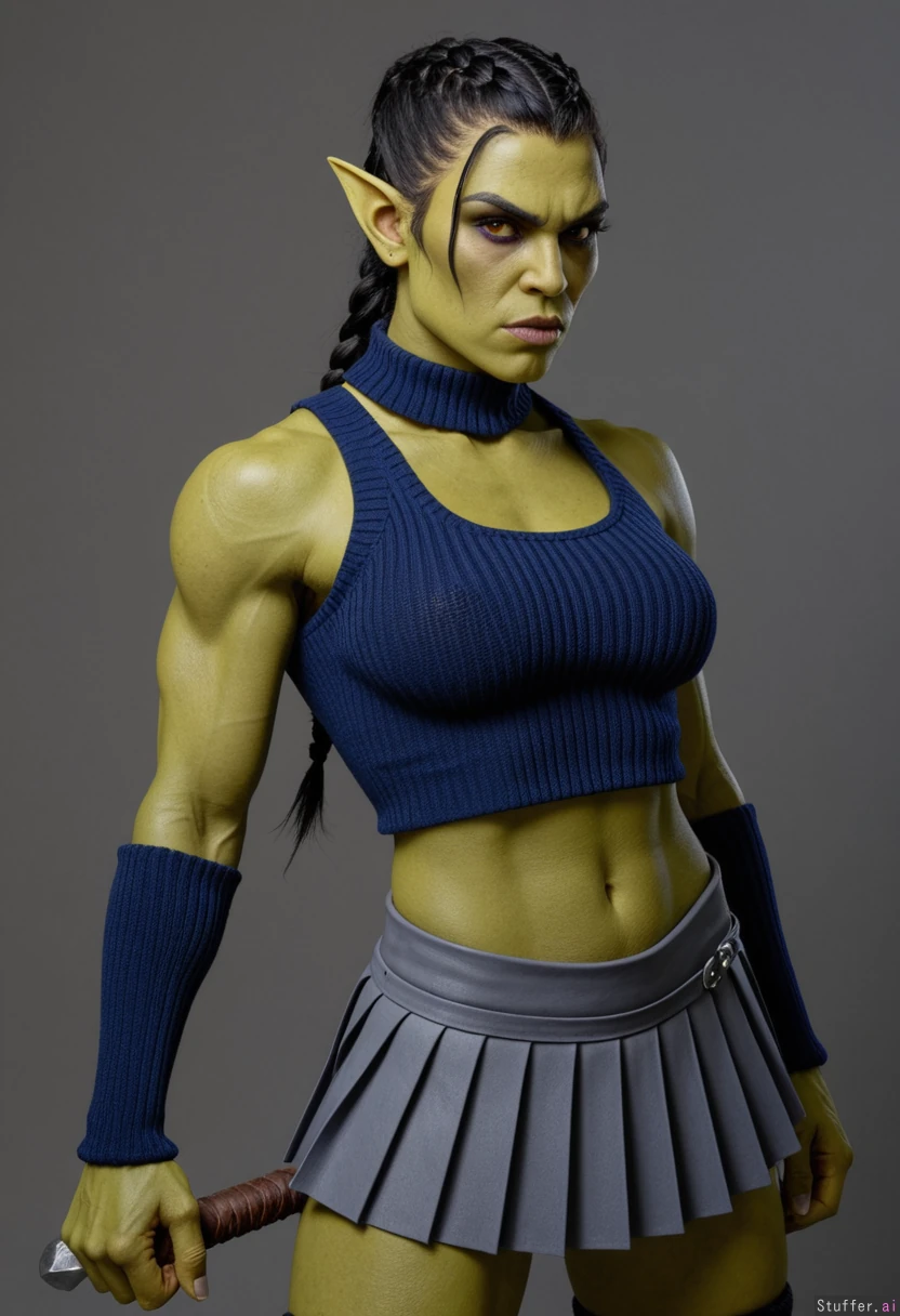 Anime Art realistic Orc woman with braided black hair. Muscular and fit, orc dominatrix Wearing a navy blue woolen crop top Wearing a pleated skirt Gray background, Hazel eyed orc, athletic Orc