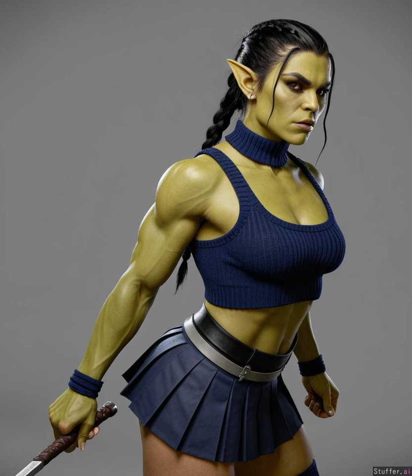 Anime Art realistic Orc woman with braided black hair. Muscular and fit, orc dominatrix Wearing a navy blue woolen crop top Wearing a pleated skirt Gray background, Hazel eyed orc, athletic Orc