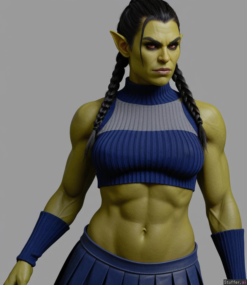 Anime Art realistic Orc woman with braided black hair. Muscular and fit, orc dominatrix Wearing a navy blue woolen crop top Wearing a pleated skirt Gray background, Hazel eyed orc, athletic Orc