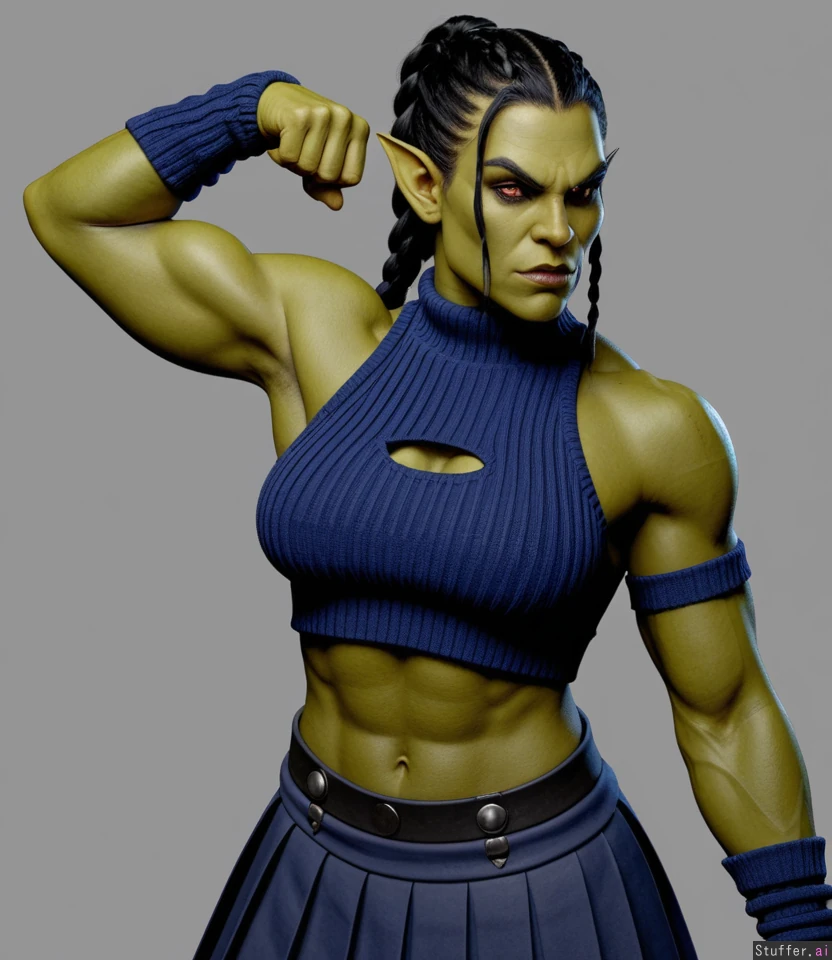 Anime Art realistic Orc woman with braided black hair. Muscular and fit, orc dominatrix Wearing a navy blue woolen crop top Wearing a pleated skirt Gray background, Hazel eyed orc, athletic Orc