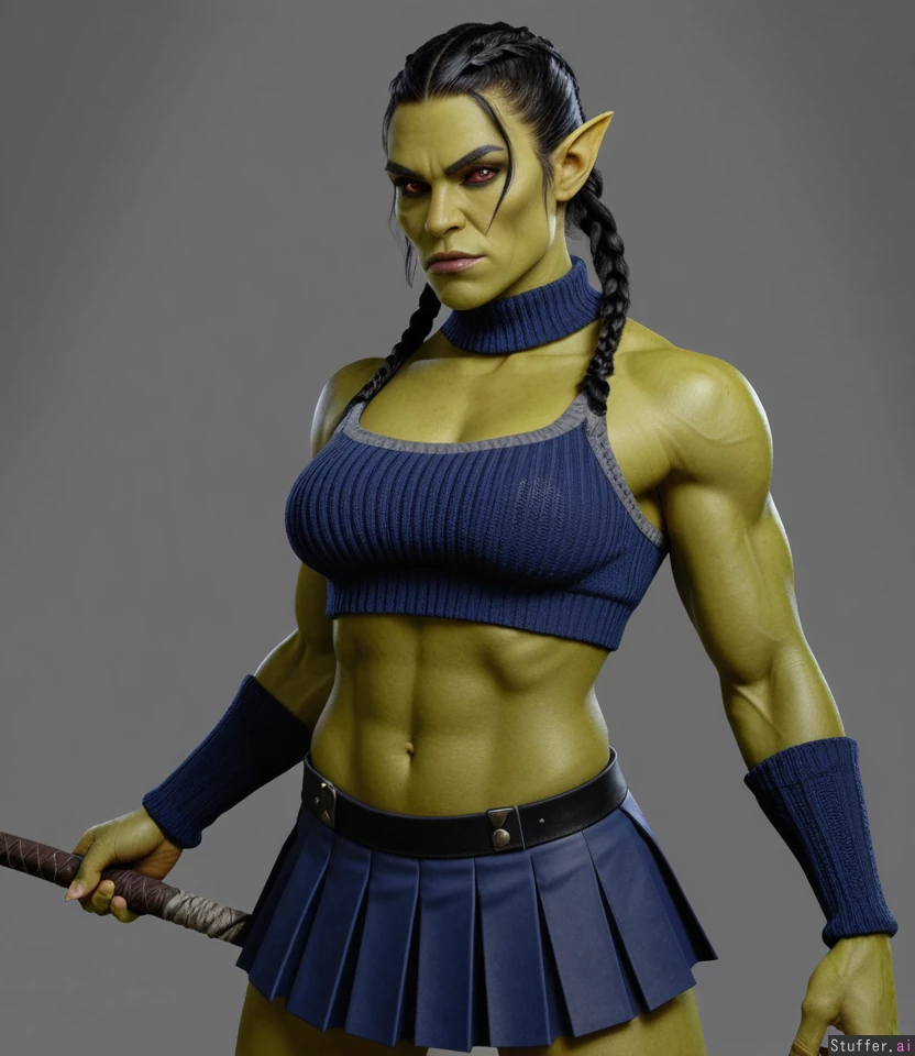 Anime Art realistic Orc woman with braided black hair. Muscular and fit, orc dominatrix Wearing a navy blue woolen crop top Wearing a pleated skirt Gray background, Hazel eyed orc, athletic Orc