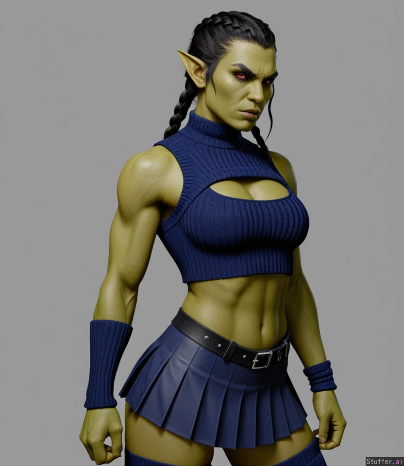Anime Art realistic Orc woman with braided black hair. Muscular and fit, orc dominatrix Wearing a navy blue woolen crop top Wearing a pleated skirt Gray background, Hazel eyed orc, athletic Orc