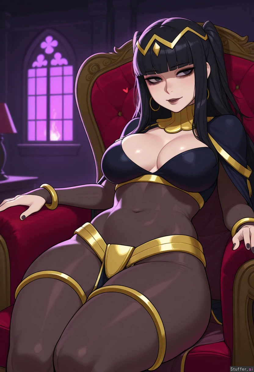 masterpiece, best quality, score_7, Krekkov(artist), KAMII MOMORU(artist) (1girl, solo, mature), (tharja, fire emblem character, black bodystocking), black hair, grey eyes, dark makeup, dominant, flirty, thick thighs, medium breasts Night, bedroom, purple lighting Sitting in a chair, leaning back