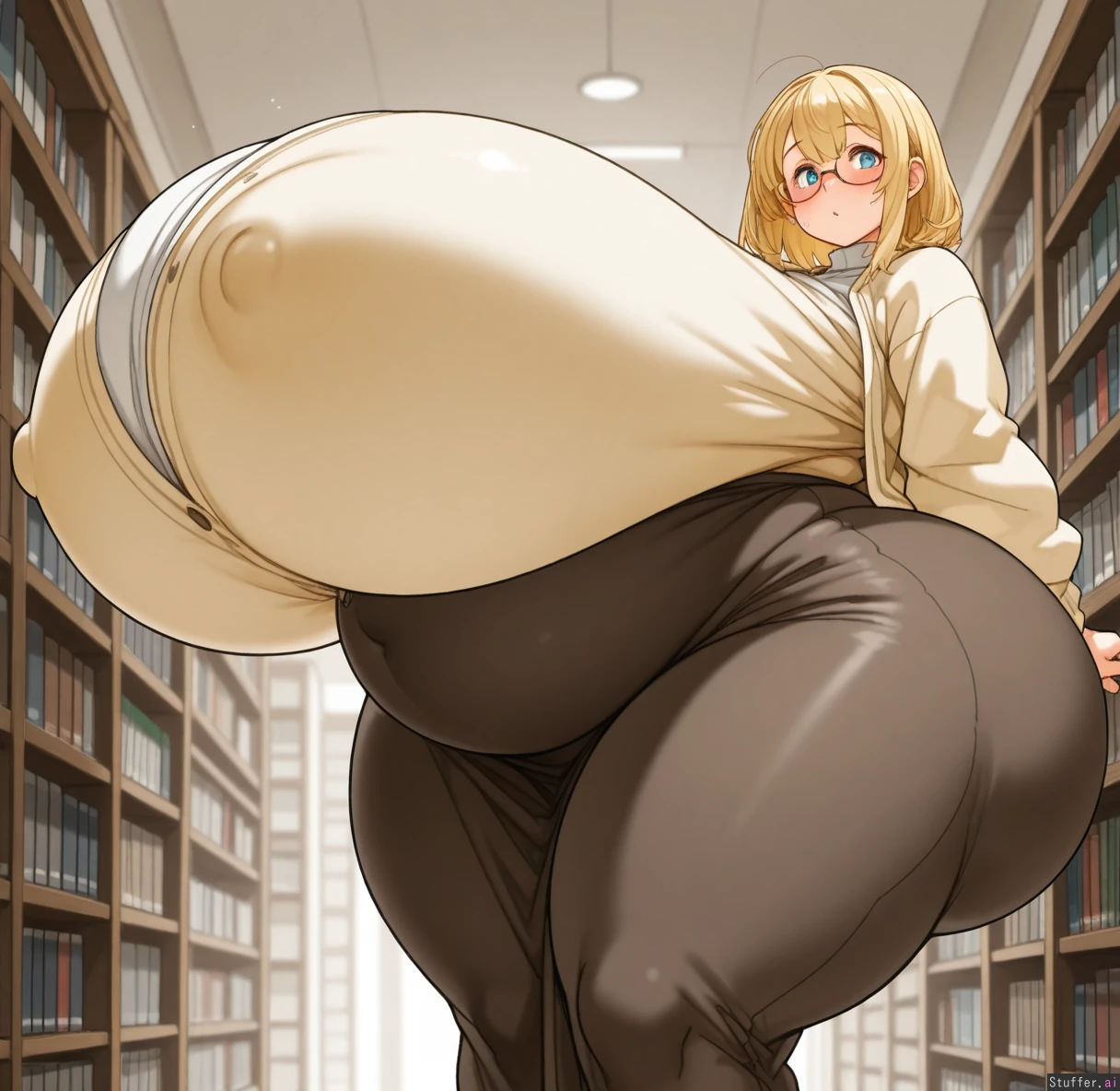 masterpiece, best quality, score_7. (, absurdres, Impeccable Detail, Premier Quality, Best-in-class, Top quality, Expressive, Cinematic, film grain, volumetric light source:1) (stylized illustration, anime-style exaggeration, bright colors, clean linework,soft shading), ((Sachito)) 1girl, erect nipple,( perfect body, perfect posture , perfect anatomy, perfect body:1),(perfect breast:1.3), (solo, blue eyes, blonde hair, medium hair, heavy blush, yellow cardigan, white undershirt, brown long skirt, glasses, library), (covered ass, covered belly, covered breast, covered legs:1), ((, thick body, wide body, wide hips, fat legs, thick thighs, hyper hips, fat legs, wide legs,)), big pregnant belly, ((( bubble butt, ballooning breast, torso breast, fake breast, firm breast))), (gigantic breast :1.7), (gigantic butt:1.7), (half body)