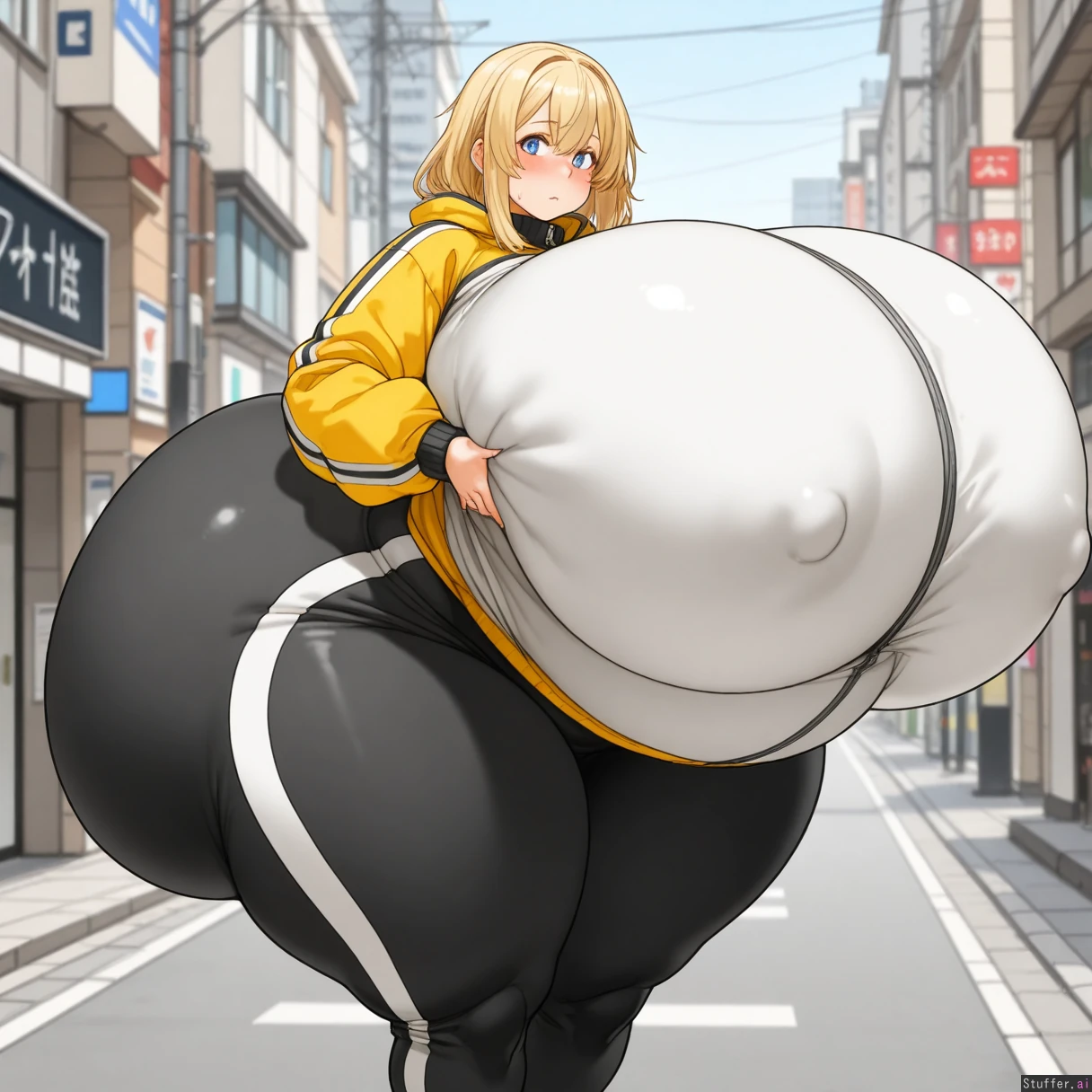 masterpiece, best quality, score_7. (, absurdres, Impeccable Detail, Premier Quality, Best-in-class, Top quality, Expressive, Cinematic, film grain, volumetric light source:1) (stylized illustration, anime-style exaggeration, bright colors, clean linework,soft shading), ((Sachito)) 1girl, erect nipples, ( perfect body, perfect posture, perfect breast, perfect anatomy, perfect body:1), (solo, blue eyes, blonde hair, medium hair, heavy blush, yellow winter jacket, white tracksuit, black leggings pants, street, shy, standing), (covered ass, covered belly, covered breast:1), (( thick body, wide body, wide hips, fat legs, thick thighs, hyper hips, fat legs, wide legs, bubble butt, bursting body, bubble butt)), big pregnant belly, ((( ballooning breast, torso breast, fake breast, firm breast))), (gigantic breast :1.7), (gigantic butt:1.7),