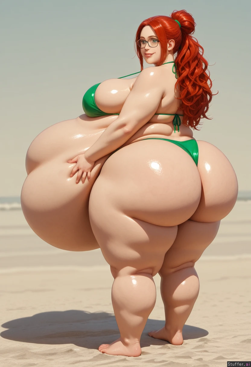 ((Photorealistic)), ((photo realism)), highly detailed, 8k, (( hyper fat:1.9)), ((enormous fat belly)), An extremely cute 18 year old girl, very long red hair, hair tied in messy bunches, hypnotic green eyes, cute smile, ((Fat belly:1.9)), ((enormous fat belly)), ((fat hips)), ((fat ass:1.8)), ((fat legs:1.7)), ((fat heavy breasts)), Tight black and green bikini, black framed glasses , cute geeky style, Beach summers day Standing, her hands resting around her massive heavy belly, she is in awe at her own belly,