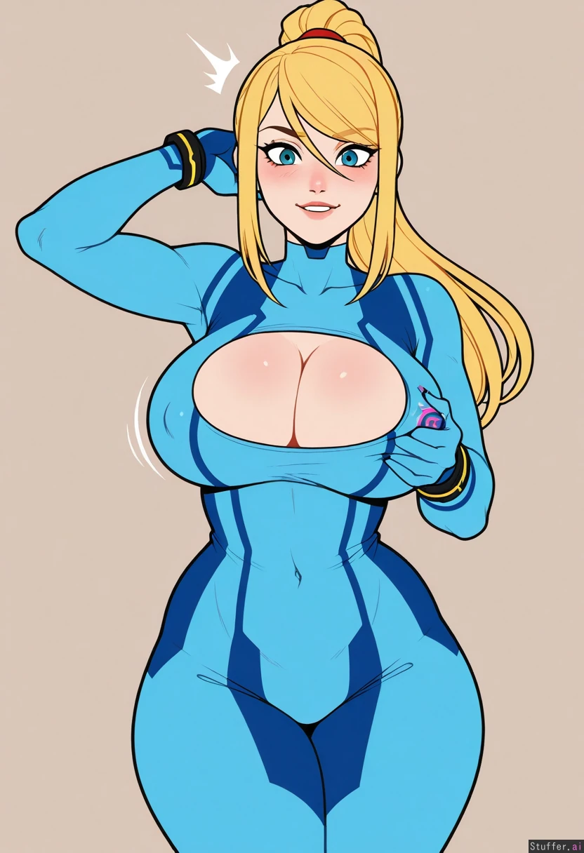 (Kinkymation(artist):0.5), (pudgeruffian(artist):0.3), Beige background, 1woman, milf, solo, (simple style), ((less detail)), ((flat colors)), (((zero suit samus))), blonde hair, round eyes, blue eyes, eye liner, cute face, looking at viewer, smiling, light skin, biting lip, posing, arms squeezing breasts, blushing, shocked ((slim)), toned belly, (Athletic build), fit figure, ((skinny)), midriff (Blue jumpsuit) Modest boobs, breast expansion, topheavy, cleavage, erect nipples ((eyes open)), Wide hips,