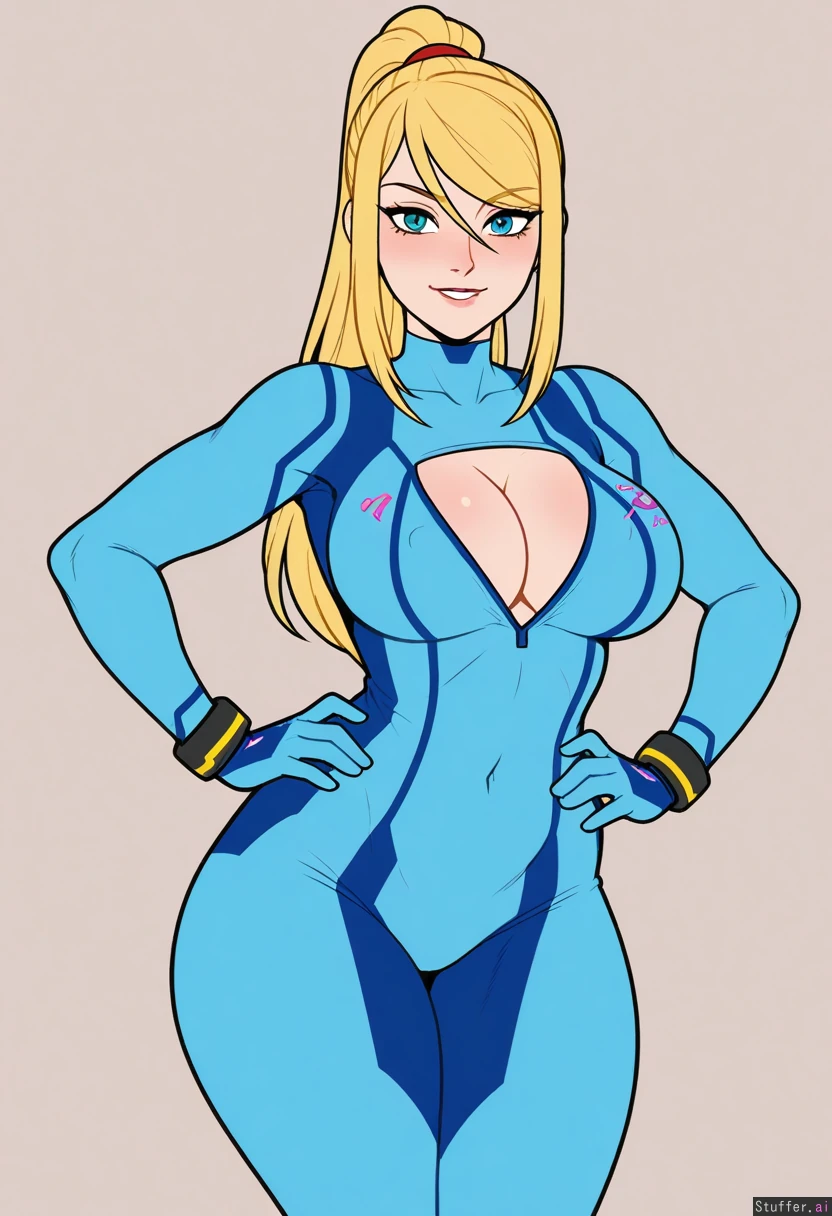 (Kinkymation(artist):0.5), (pudgeruffian(artist):0.3), Beige background, 1woman, milf, solo, (simple style), ((less detail)), ((flat colors)), (((zero suit samus))), blonde hair, round eyes, blue eyes, eye liner, cute face, looking at viewer, smiling, light skin, biting lip, posing, hands on hips, blushing, shocked ((slim)), toned belly, (Athletic build), fit figure, ((skinny)), midriff (Blue jumpsuit) Modest boobs, breast expansion, topheavy, cleavage, erect nipples ((eyes open)), Wide hips, thick thighs