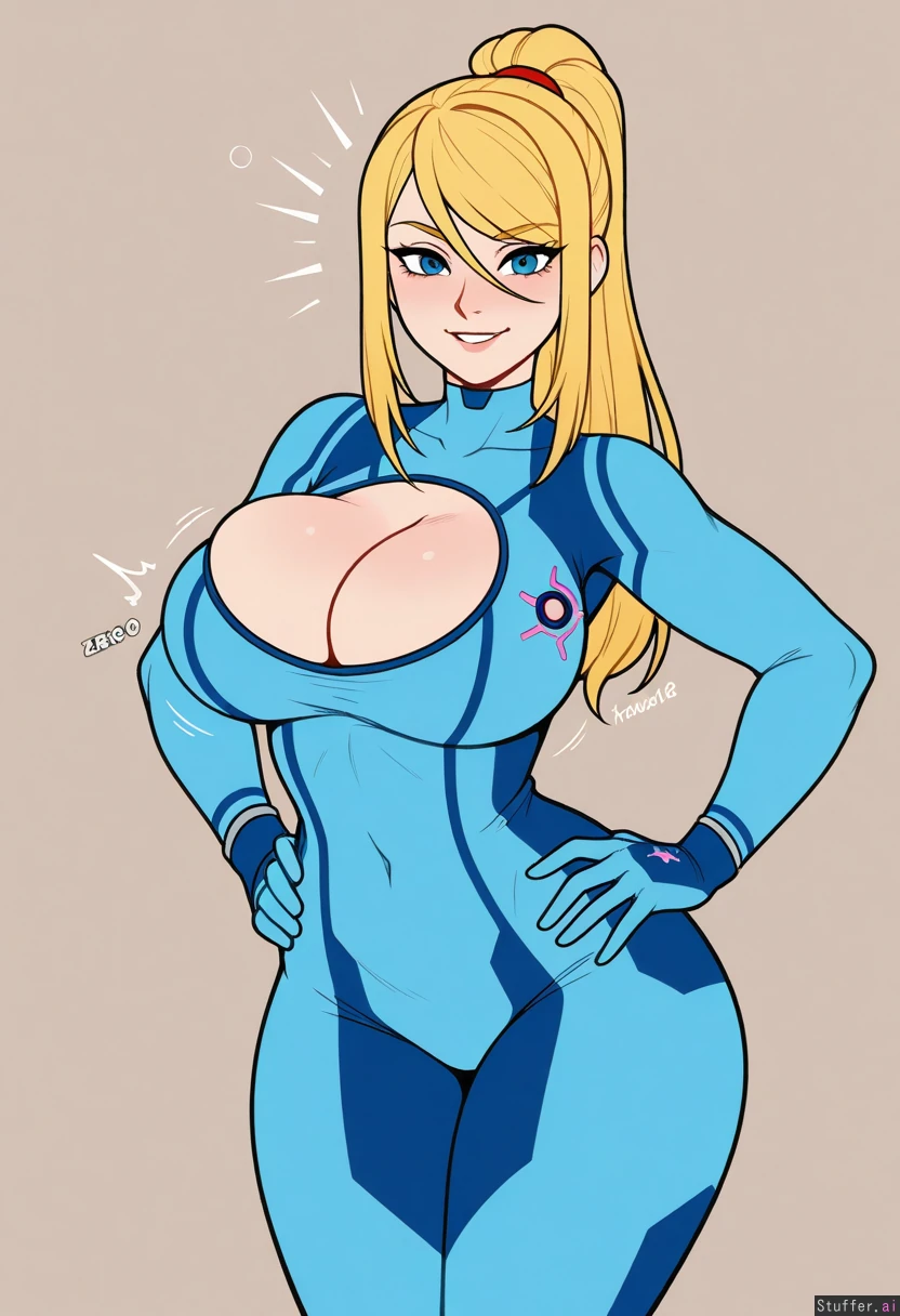 (Kinkymation(artist):0.5), (pudgeruffian(artist):0.3), Beige background, 1woman, milf, solo, (simple style), ((less detail)), ((flat colors)), (((zero suit samus))), blonde hair, round eyes, blue eyes, eye liner, cute face, looking at viewer, smiling, light skin, biting lip, posing, hands on hips, blushing, shocked slim, toned belly, Athletic build, fit figure, skinny, midriff, voluptuous (Blue jumpsuit) Large boobs, (breast expansion), (topheavy), cleavage, erect nipples ((eyes open)), (Wide hips), thick thighs, bubble butt