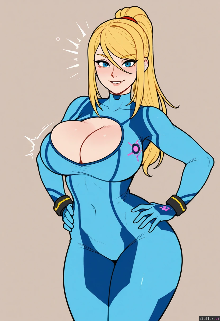 (Kinkymation(artist):0.5), (pudgeruffian(artist):0.3), Beige background, 1woman, milf, solo, (simple style), ((less detail)), ((flat colors)), (((zero suit samus))), blonde hair, round eyes, blue eyes, eye liner, cute face, looking at viewer, smiling, light skin, biting lip, posing, hands on hips, blushing, shocked Curvy, toned belly, Athletic build, fit figure, voluptuous (Blue jumpsuit) Large boobs, (breast expansion), (topheavy), cleavage, erect nipples ((eyes open)), (Wide hips), thick thighs, bubble butt
