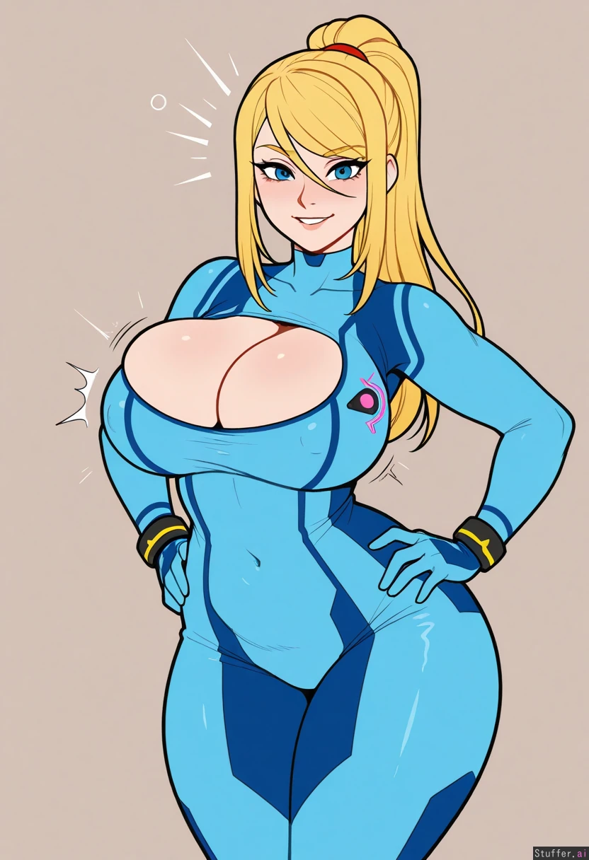 (Kinkymation(artist):0.5), (pudgeruffian(artist):0.3), Beige background, 1woman, milf, solo, (simple style), ((less detail)), ((flat colors)), (((zero suit samus))), blonde hair, round eyes, blue eyes, eye liner, cute face, looking at viewer, smiling, light skin, biting lip, posing, hands on hips, blushing, shocked Curvy, belly, Athletic build, thicker figure, voluptuous, weight gain (Tight Blue jumpsuit) Large boobs, ((breast expansion)), (topheavy), cleavage, erect nipples ((eyes open)), (Wide hips), thick thighs, bubble butt