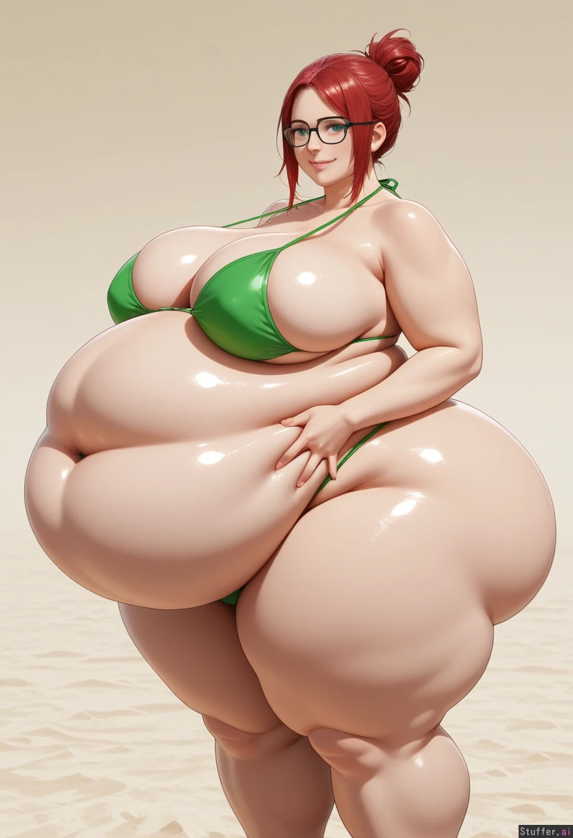 ((Photorealistic)), ((photo realism)), highly detailed, 8k, (( hyper fat:1.9)), ((enormous fat belly)), An extremely cute 18 year old girl, very long red hair, hair tied in messy bunches, hypnotic green eyes, cute smile, ((Wide hips:1.8)), ((Fat belly:1.9)), ((enormous fat belly)), ((fat hips)), ((fat ass:1.8)), ((fat legs:1.7)), ((fat heavy breasts)), Tight black and green bikini, black framed glasses , cute geeky style, Beach summers day, her hands resting around her massive heavy belly, she is in awe at her own belly,