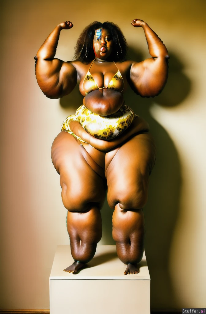 realistic, high quality, african bbw, wearing a white bikini, (brown hair:1.4), (ultra huge arms:1.9), (ultra huge legs:1.9), (ultra leg rolls:1.8), (ultra fat legs:1.8), (ultra arm roll:1.5), bare feet:1.5,